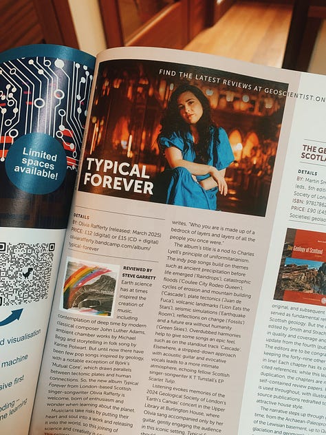 I got a few copies of Geoscientist Magazine in the mail, which contain a review of my album! My first album review in PRINT! And it’s in a geology magazine lmao